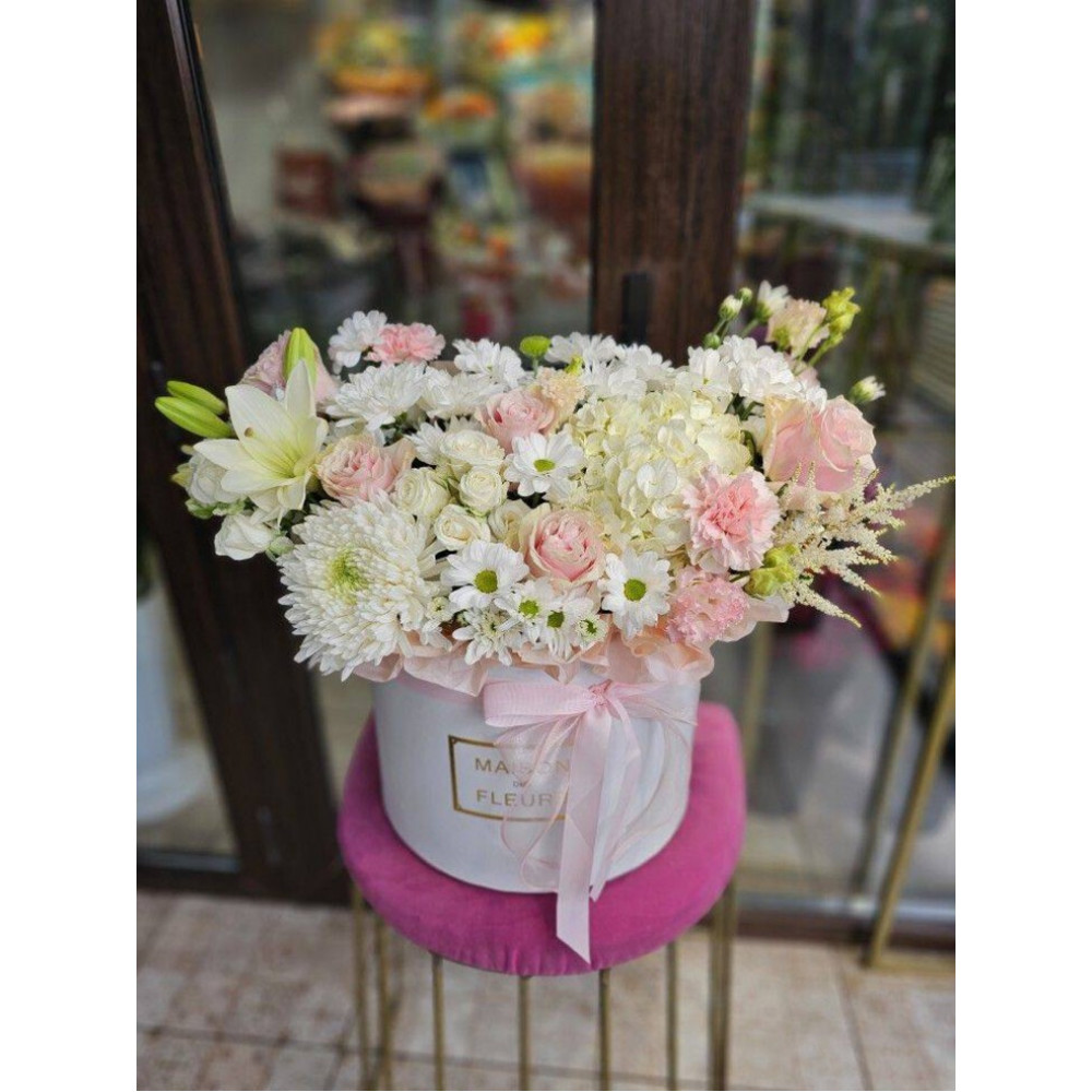 Для создания элегантного и стильного букета в коробке с белыми лилиями, розами и экзотическими цветами, а также зеленью, важно учесть гармоничное сочетание цветов и текстур. Вот примерный состав и рекомендации по выбору цветов и зелени: