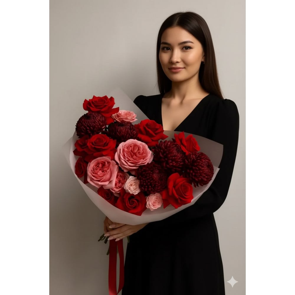 • Букет из роз, пионовидных роз, хризантем, спрей роз
